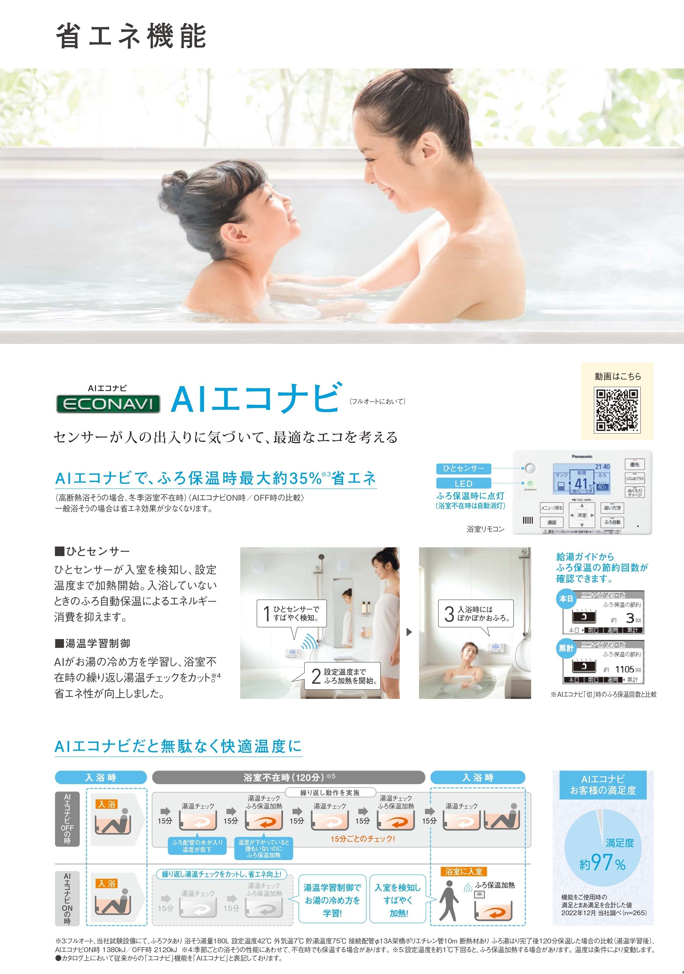 AIがお湯の冷め方を学習し、浴室不在時の繰り返し湯温チェックをカットし省エネ性が向上。