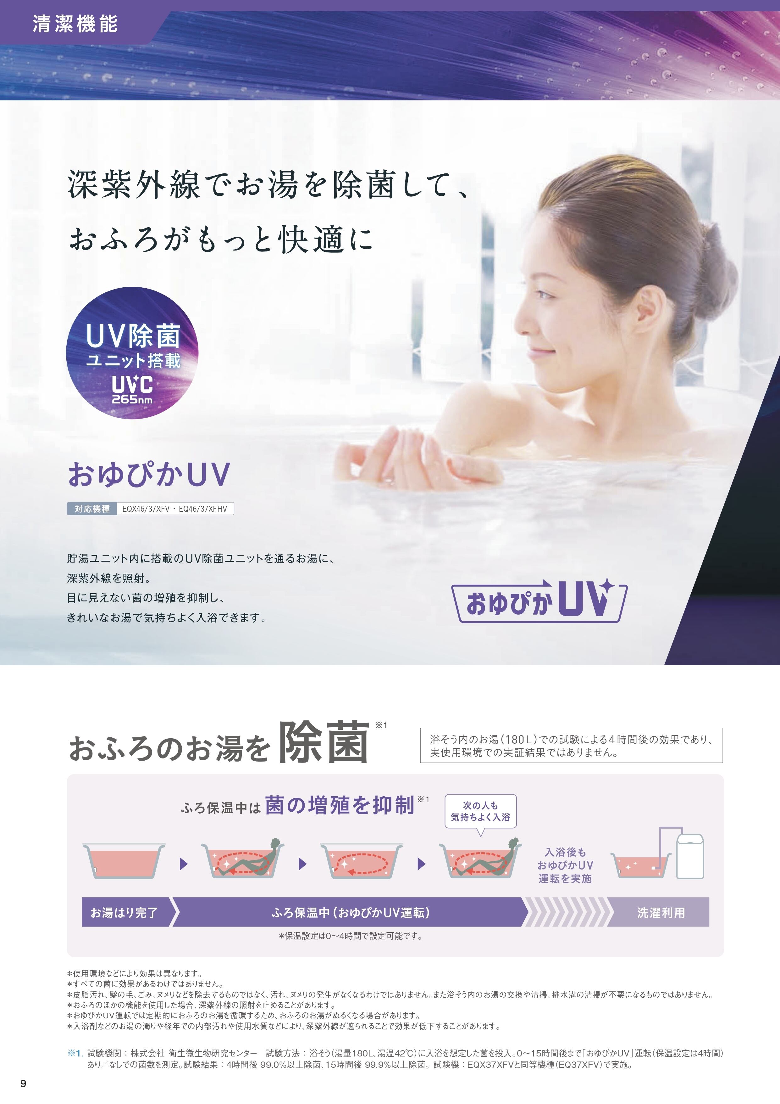 貯湯ユニット内に搭載のUV除菌ユニットを通るお湯に、深紫外線を照射。
