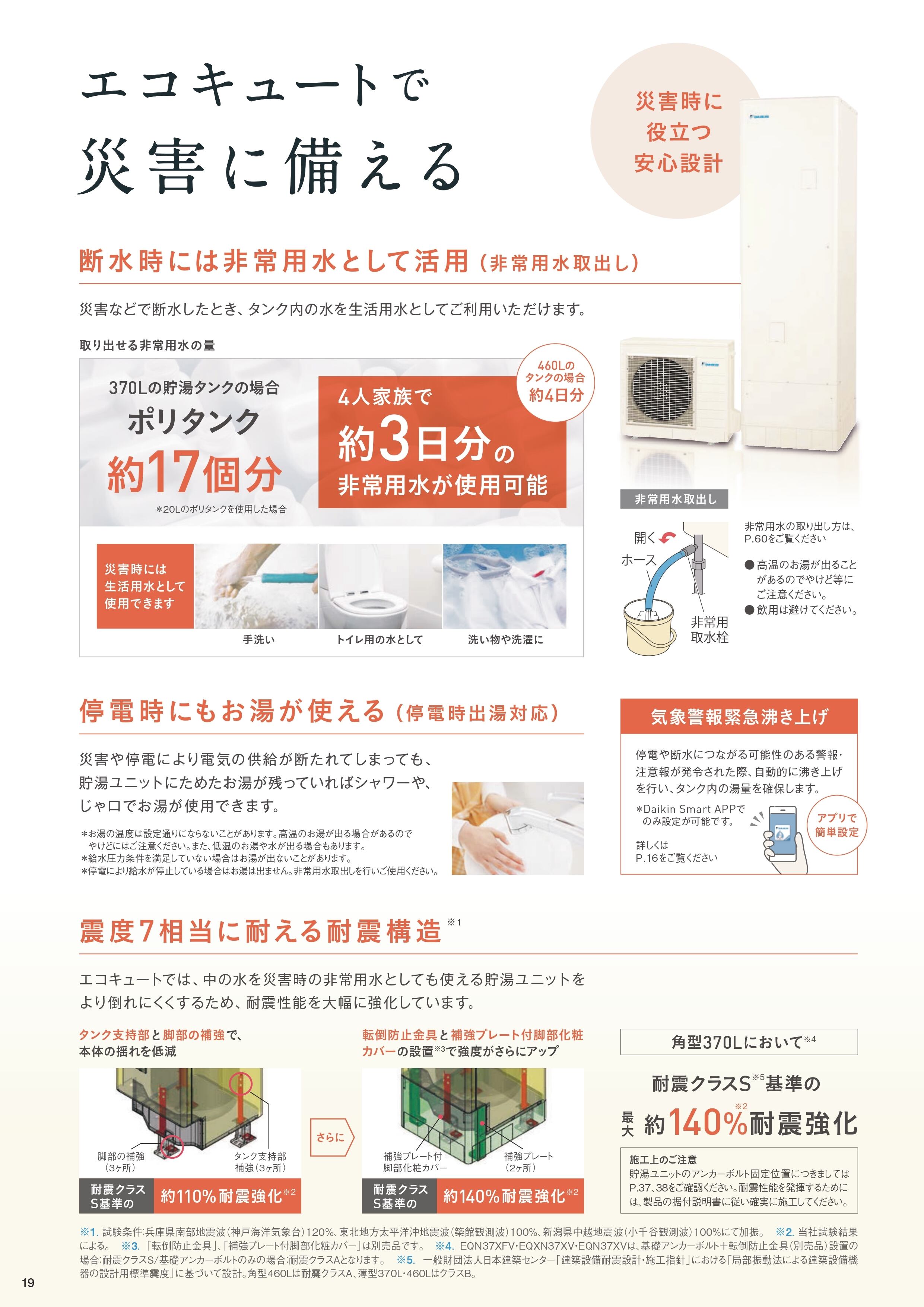 災害時に備えて、停電や断水につながる可能性のある警報・注意報が発令されると、自動的に沸き上げを行います。